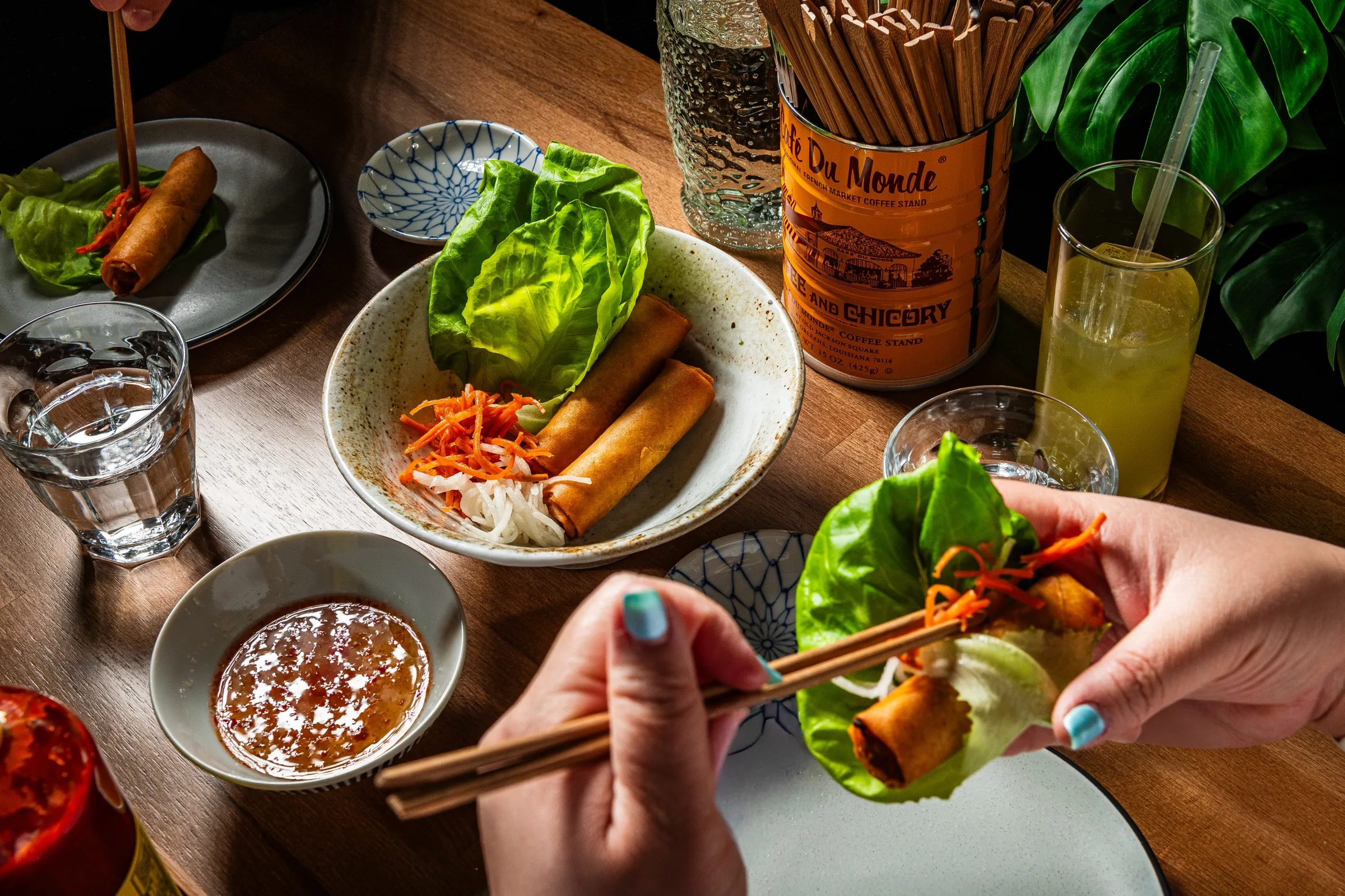 In terms of appetizers, one dish channels honey walnut shrimp, a popular Chinese food favorite but reimagined with candied pecans—a nod to Louisiana culinary influences. He notes that the unexpected star of the menu might be the vegan lemongrass meatball, which offers a plant-based alternative to pork xiu mai, slow-cooked in a sauce of tomato and Thai basil, replacing fish sauce with a fermented pineapple sauce.