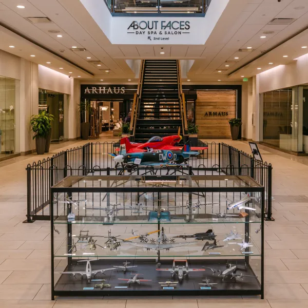 A thematic window installation showcased on the upper level of the mall features artwork inspired by aviation and aerospace. Additionally, historic artifacts, including aircraft propellers, a World War II bomber jacket, pilot uniforms, and a selection of other significant memorabilia from the museum, draw attention to the rich history of flight.