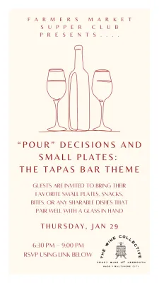 The Farmers Market Supper Club is thrilled to host a community event on January 29, titled Pour Decisions & Small Plates: The Tapas Bar Theme. This gathering will take place at The Wine Collective in Baltimore from 6:30 PM to 9 PM. Guests are invited to bring a small plate, snack, or bite to share with the group.