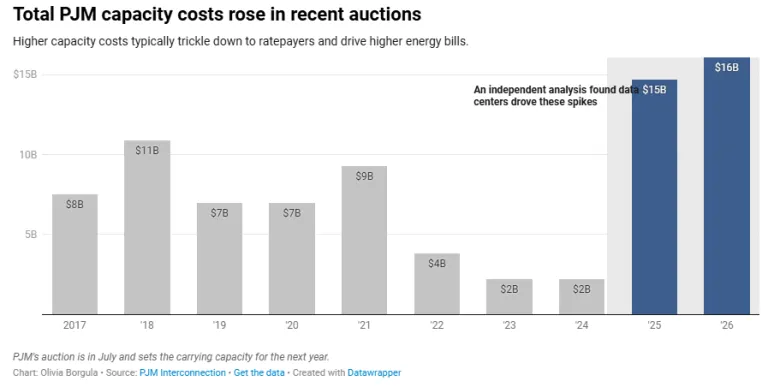 In the 2024 PJM auction, capacity costs skyrocketed from approximately $2 billion to nearly $15 billion for the upcoming year. The latest auction to set rates for the 2026-27 period saw record costs exceed $16 billion, which might have escalated further had it not been for a cap requested by Pennsylvania Governor Josh Shapiro and supported by Maryland Governor Wes Moore.