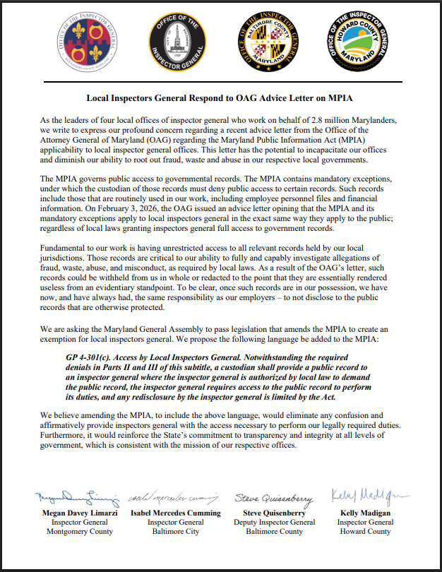 They have called upon lawmakers to institute an exemption for local inspector general offices within the MPIA, ensuring they have the necessary access to information and reinforcing the State’s dedication to transparency and accountability in all government activities.