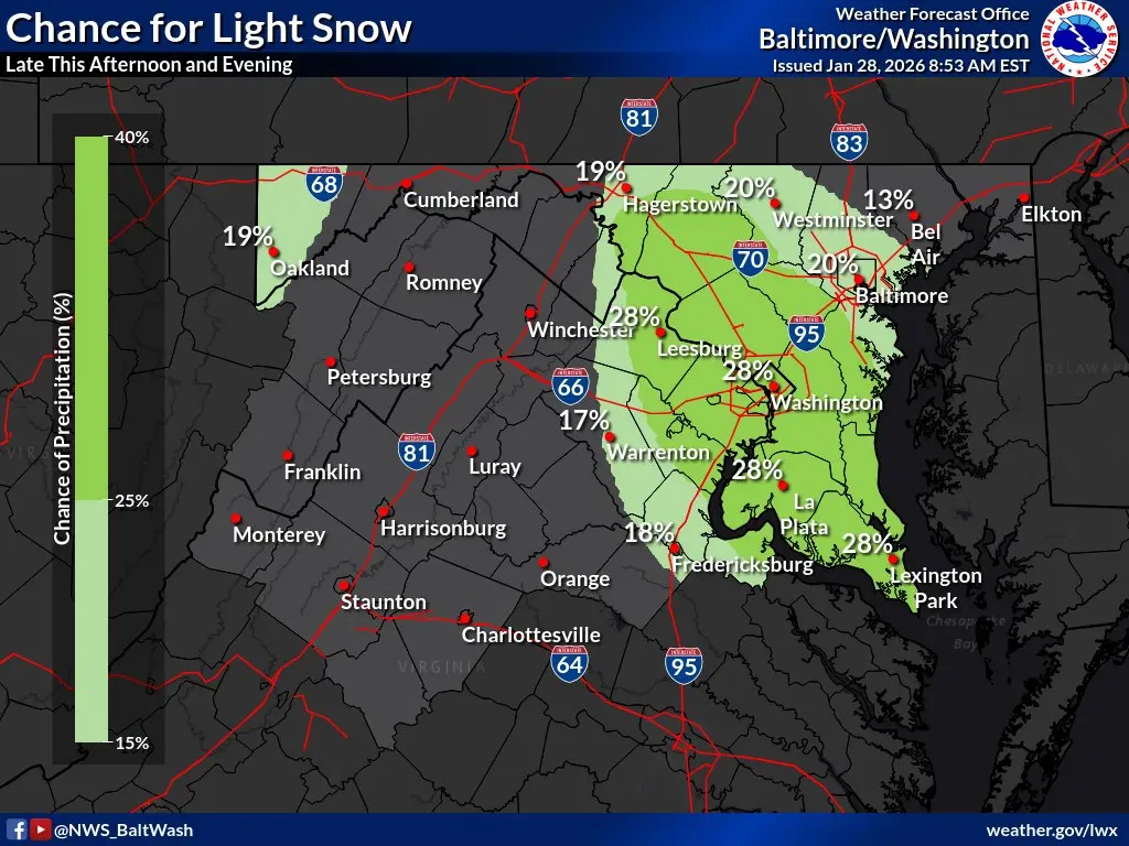 Forecasters also mentioned a 20 to 30 percent chance of light snow moving through the Baltimore area from northwest to southeast later on Wednesday afternoon into the evening.