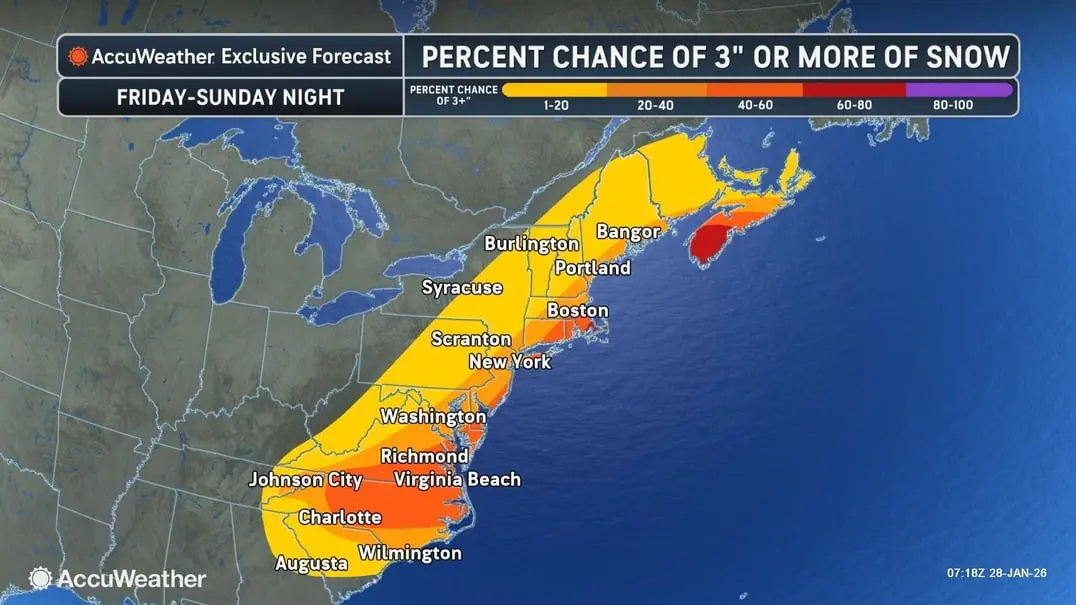 AccuWeather predicts that the Baltimore area has a 20 to 40 percent chance of receiving 3 or more inches of snow, with less than a 20 percent chance of accumulating 6 inches or more.