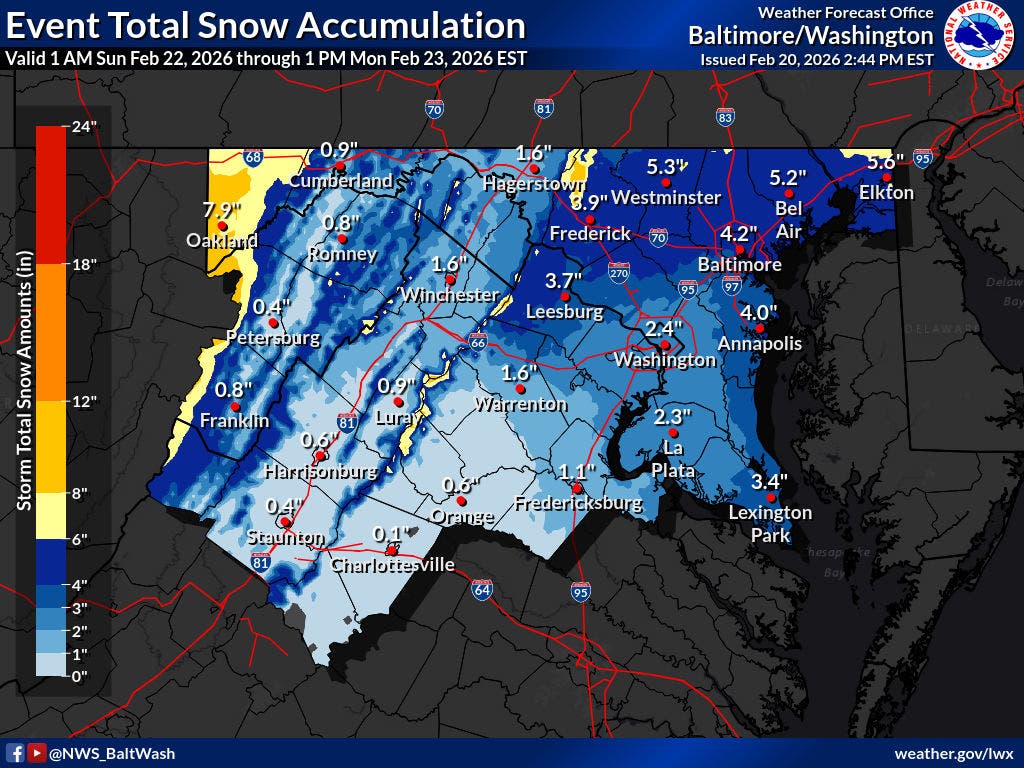 The National Weather Service issued a winter storm watch for several areas in Maryland, anticipating a coastal system that could bring up to 5 inches of snow to certain regions.